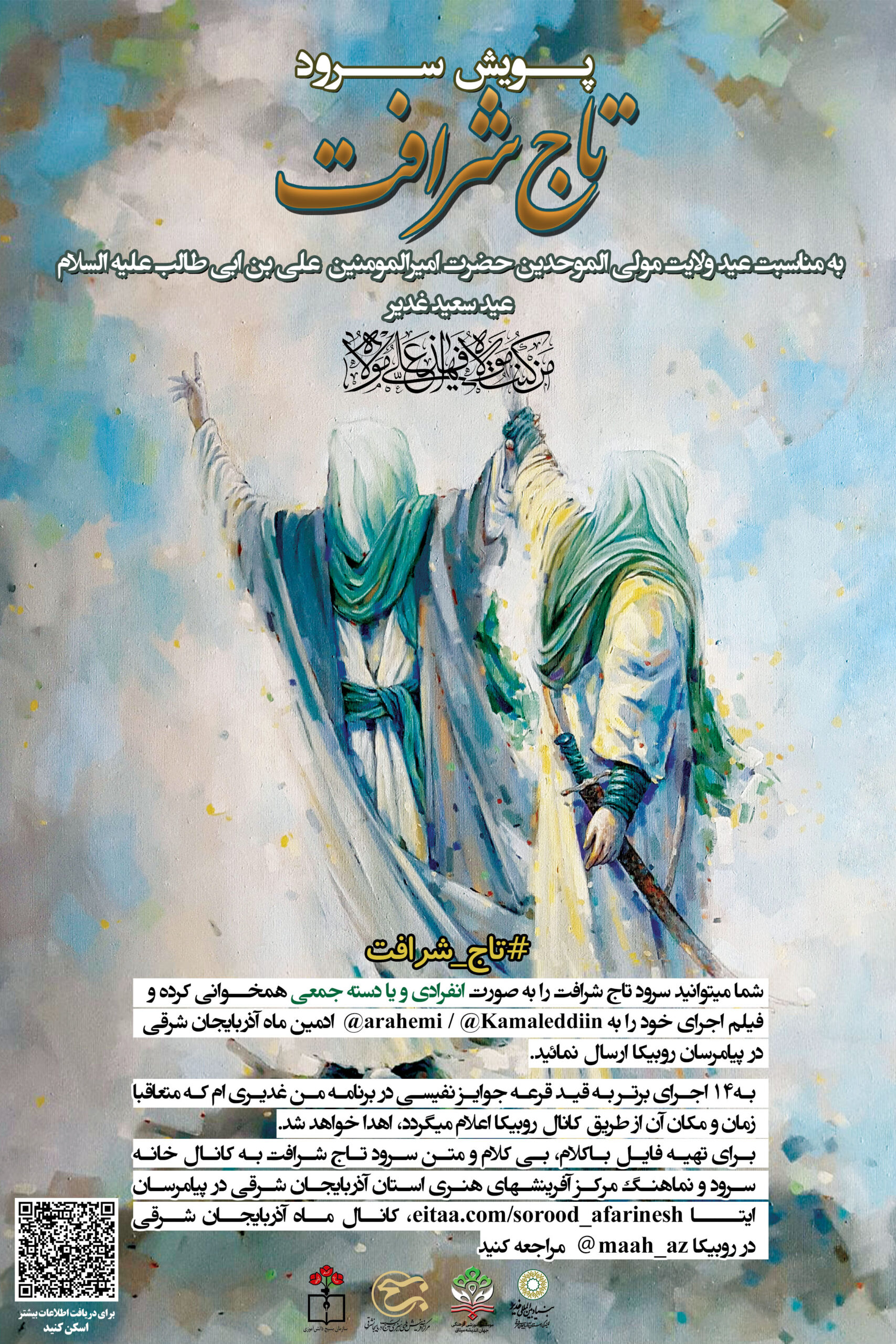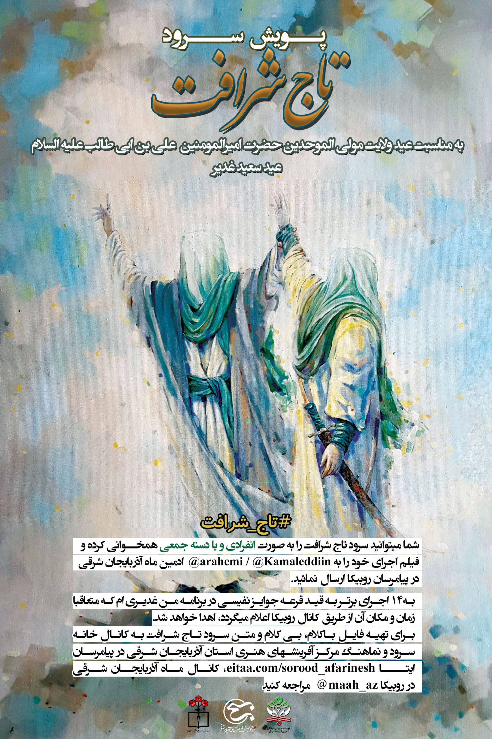 به14 اجرای برتر به قید قرعه جوایز نفیسی در برنامه من غدیری ام که متعاقبا زمان و مکان آن از طریق کانال روبیکا اعلام میگردد، اهدا خواهد شد. برای تهیه فایل باکلام، بی کلام و متن سرود تاج شرافت به کانال خانه سرود و نماهنگ مرکز آفرینشهای هنری استان آذربایجان شرقی در پیامرسان ایتـــا eitaa.com/sorood_afarinesh، کانال ماه آذربایجان شرقی در روبیکا maah_az مراجعه کنید.
